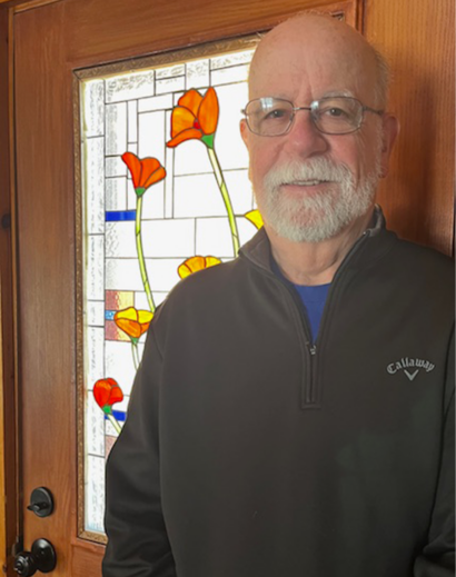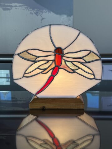 “I have been working with stained glass for over 45 years. I started big, my first piece was a stained glass lamp shade that we still have hanging in our dining room. Since that time, I have created and restored a number of glass panels, traditional and contemporary lamps, wall/window hangings, mosaics, and have incorporated my hand-built porcelain flowers into the few glass panels creating a three dimensional look. My newer pieces incorporate glass etching to provide an additional layer and depth to the glass.